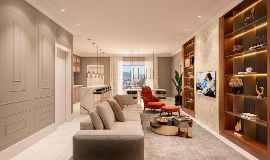 Piso em porcelanato no living, sacada, cozinha, área de serviço, banheiros e lavabo;